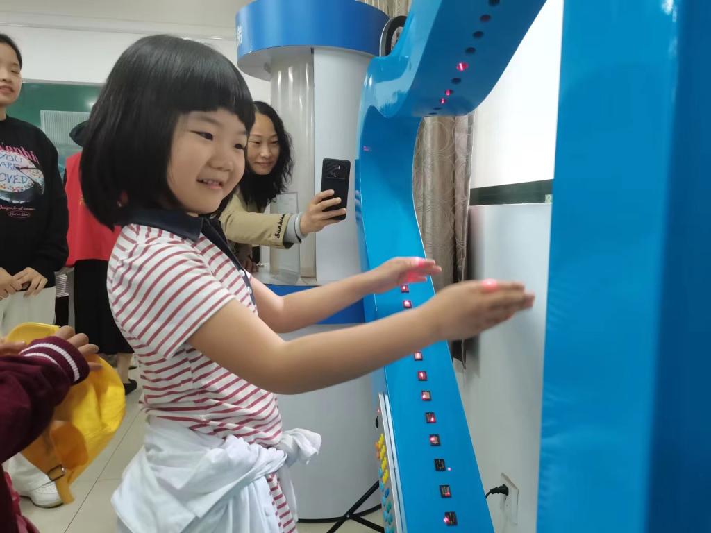 神奇的实验现象使得小朋友们沉浸其中,同时也激发了他们兴趣和对现象的思考,他们叽叽喳喳地讨论着“为什么会这样?”。当亲身接触到仪器的时候,小朋友们都露出可爱的笑容,眼神里也充满着好奇和对知识的渴望。通过这些演示实验,小朋友们初步认识到了动量守恒定律、电磁感应现象、静电屏蔽、全息影像等物理相关的现象。