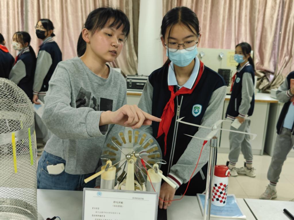 实验室里不像书中有晦涩难懂的公式、生僻枯燥的专业名词,取而代之的是直观生动的物理现象,“锥体上滚”、“静电引力球”、“牛顿摆动量守恒”、“气体弧光放电”、“离心力演示”等各种各样有趣的现象,在志愿者的演示下如同变戏法一样地展示了出来,牢牢地吸引了孩子们的注意力。他们全神贯注地看着,专心致志地听着,不放过任何一个细节。