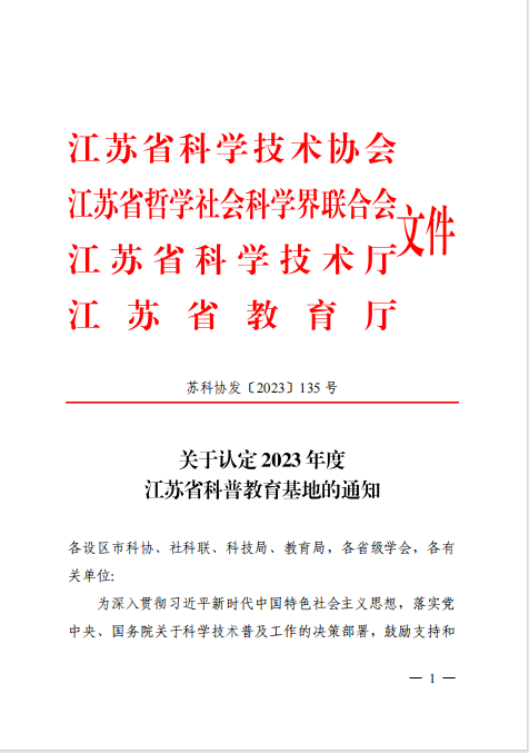 近日,江苏省科学技术协会、江苏省哲学社会科学界联合会、江苏省科学技术厅、江苏省教育厅联合下发《关于认定2023年度江苏省教育基地的通知》(苏科协发〔2023〕135号),williamhill英国继获苏州市科普教育基地后,成功获批江苏省“青少年物理实验科普基地(苏州)”。