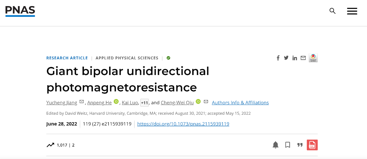 姜昱丞团队本次入选的成果是基于2022年发表于《美国国家科学院院刊》(PNAS)的研究论文《Giant bipolar unidirectional photomagnetoresistance》,团队利用首创的微纳工艺方法构建出新型二维硒化钨/二维电子气范德华异质结,并首次观察到了光诱发的巨大正负磁电阻共存现象,且正磁电阻和负磁电阻都达到了当前领域内的最高水平。该工作还提出了光调谐自旋电子器件的新体系和新理论,在光磁传感、智能存储、磁成像等领域具有广泛的应用前景。该研究成果符合省内重大研发需求和技术创新导向,体现了我校在省内相关科研领域的领先地位。