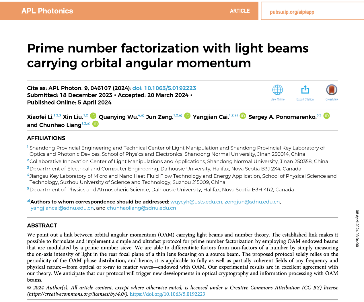 近日,我校吴泉英教授作为通讯作者之一,与山东师范大学物理与电子科学学院、光场调控及应用中心蔡阳健教授团队一起取得一项研究成果。该研究首次建立了轨道角动量光束与数论之间的独特联系,并利用质数筛选器调制的轨道角动量光束,成功制定并实现了一种新颖且高效的质数因子分解协议。这一开创性的成果以“Prime number factorization with light beams carrying orbital angular momentum”为题,发表在物理学一区期刊《APL Photonics》上。论文提出并实现了一种概念简单、高效的经典光学方法来进行质数分解,该方法基于携带轨道角动量的涡旋光束在自由空间中传播相位分布的固有周期性,待分解的因数对应于光束的拓扑电荷,并且所有试验因子都被封装到筛选器中,实验上利用数字微镜装置快速刷新筛选器以改变试验因子理论上可以在3.55秒内分解出高达10^6数量级的所有质数。