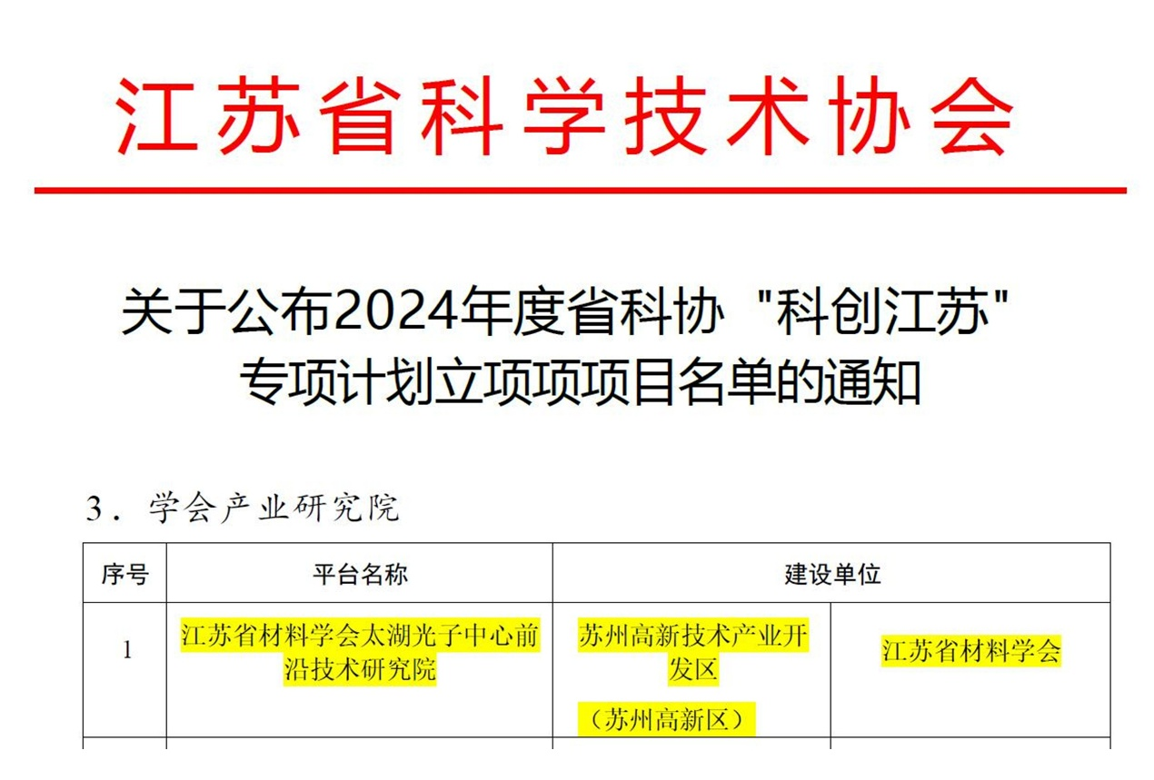 日前,江苏省科学技术协会公布2024年度“科创江苏”专项计划立项名单,我校太湖光子中心前沿技术研究院成功入选学会产业研究院项目(省级平台建设类)。
