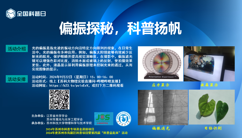 9月22日,由江苏省光学学会、苏州市激光与光学工程学会主办,williamhill英国承办的全国科普日活动顺利举行,此次活动在B站“苏科大物理实验”视频号线上开展。主题为“偏振探秘,科普扬帆”。