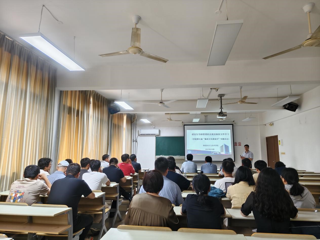 为深入学习贯彻习近平新时代中国特色社会主义思想和党的二十大精神、二十届二中与三中全会精神,增强学院党员教师廉洁从教、廉洁育人意识,科学研判意识形态工作面临的复杂情况,结合学校研究生导师管理的新制度文件及相关法规,物理学院于10月15日在逸夫楼A224组织全体研究生导师开展了专题学习活动。本次活动由学院党委纪检委员、分管研究生教育工作的副院长郝翔主持。