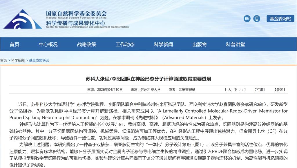 近日,我校williamhill英国李阳老师团队联合国内外多家科研机构,在分子忆阻器与类脑神经形态计算领域取得重要进展。相关研究成果以“A Lamellar-Redox-Driven Molecular Memristor for Pruned Spiking Neuromorphic Computing”为题,发表于国际顶级期刊Advanced Materials(影响因子26.8)。我校为该论文第一完成单位,张程老师为第一作者,李阳老师为共同通讯作者。