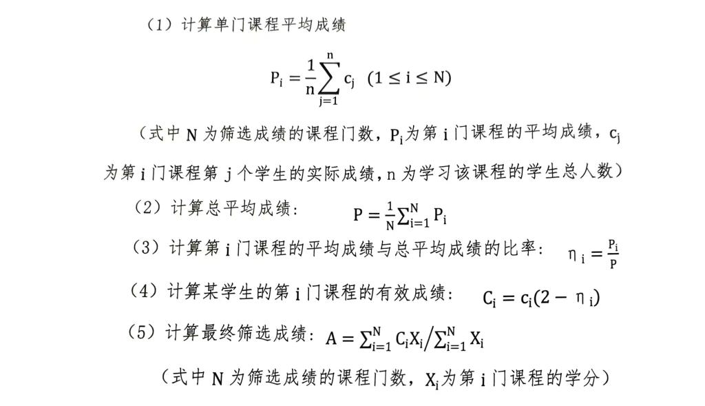由于不同课程评分标准不一致,存在有的课程成绩偏高,和有的课程成绩偏低等不均衡现象,从而使选不同课程的同学之间成绩的比较存在较大差异。为了体现公平评价的原则,本学院采用如下的筛选成绩计算方法: