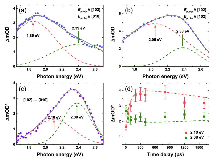 该工作主要利用飞秒瞬态吸收光谱研究了n型β-Ga2O3晶体中双光子激发的超快载流子俘获和复合过程。实验发现由缺陷产生的宽带吸收光谱是偏振相关的,并把观察到的缺陷相关吸收特征归因于从价带到本征缺陷(如镓空位)的不同电荷态的光学跃迁。论文提出了单缺陷诱导的多级俘获载流子模型,阐明了缺陷俘获空穴比俘获电子更有效,缺陷的吸收截面至少是自由载流子的十倍。该工作揭示了β-Ga2O3在超快和宽带光电子器件中的潜在应用,譬如光伏、宽带光限幅和超快全光调制等器件。