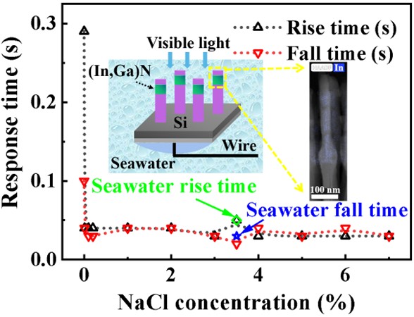 该论文基于(In,Ga)N/GaN核壳异质结纳米柱,成功制备了能在海水中进行光电检测的自驱动光电化学型探测器。研究表明,与纯水中的探测器相比,海水中的电流尖峰(overshooting)效应可以大幅提升探测器的响应速度,使上升阶段的响应时间减少80%,而产生尖峰效应的重要因素是瞬时温度梯度,以及载流子在半导体/电解质界面上的积累和复合。这项工作为开发新型自驱动探测器,并广泛应用于海洋探测和通信等领域提供了理论和实验基础。