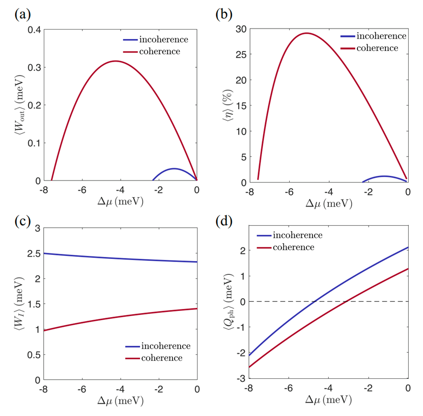 图1. 三端口量子热机的在相干输运和非相干输运下的性能比较,从图中可以发现,量子相干效应可以提高周期性驱动非弹性量子热机的输出功和能量转换效率。