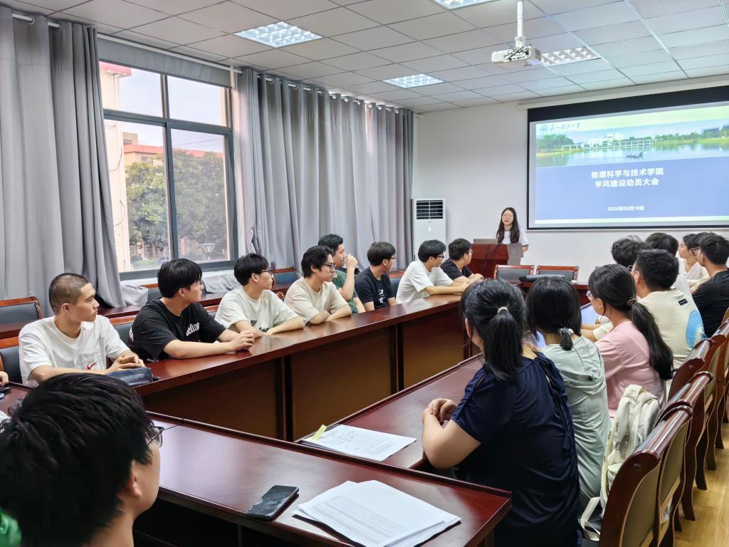 为进一步提升人才培养质量,做好学风建设工作,迎接本科教育教学审核评估,williamhill英国于9月18日晚在教二226会议室召开学风建设班干部动员大会。会议由物理学院辅导员顾彦秋主持召开,2021级、2022级、2023级本科生全体班长、团支书参加会议。