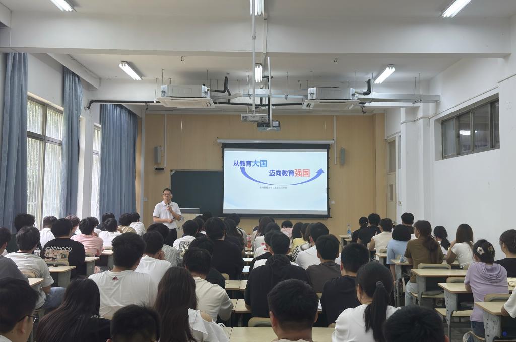 唐柏鉴以《从教育大国迈向教育强国》为主题,结合《教育强国建设规划纲要(2024—2035 年)》,深入阐述了教育强国建设的重大战略意义。通过丰富的案例与数据,唐柏鉴生动解读了教育在推动经济社会高质量发展、促进全体人民共同富裕等方面的关键作用,鼓励师范专业学生坚定理想信念,努力提升专业素养,为投身教育事业做好充分准备。现场,同学们认真听课、积极互动,在交流环节踊跃发言,分享自己对教育强国的理解及未来从教的规划。