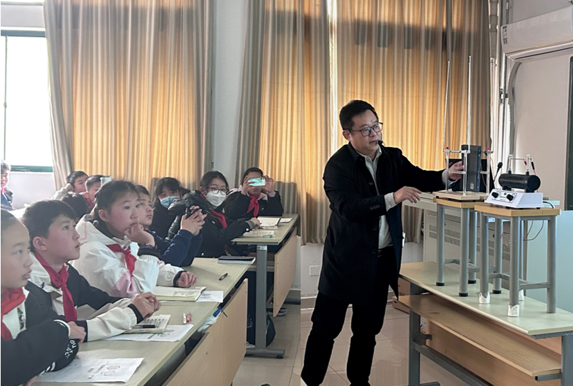 双方教师就物理师范生培养、科普实验进课堂、党建工作等方面开展了交流,对教育实习、研习、教师制作物理教具和学生心理健康等内容开展了讨论,对师范生高质量培养提出了建议。随后,张晓渝为中学生做了“电磁波的产生和发射”的科普讲座,用赫兹实验向学生展示了电磁振荡效应和电磁波的传播,学生们对电磁波传输密码产生了浓厚的兴趣。讲座后,学生们参观了物理科普实验室,激光李萨如图形、静电屏蔽“会爬坡”的锥体、神奇的“鱼洗”等实验给学生们留下来深刻的印象,边观察边体验物理实验,通过老师们对实验的示范讲解,了解物理知识