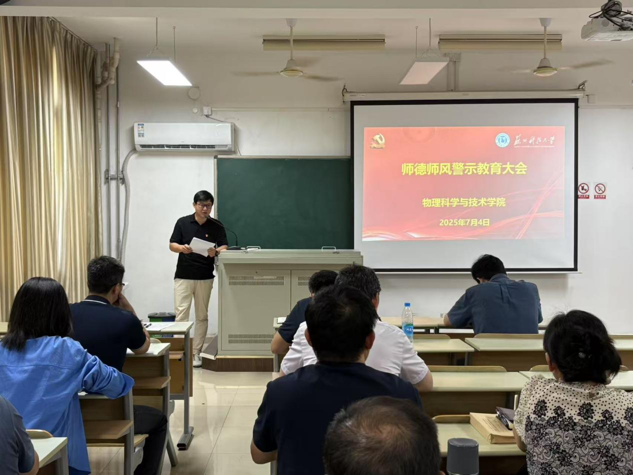 74日下午物理科学与技术学院在逸夫楼224召开师德师风警示教育大会。学院班子成员、全体教职工参加。会议由党委书记孙云飞主持。