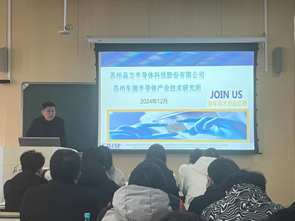 宣讲会上,晶方科技副总经理顾强围绕集成电路半导体产业概况、发展前景、企业文化、人才需求、职业发展路径等进行了详细的宣讲,让在座同学对未来的就业前景有了直观的认识。随后,事业部总监张桂瑾通过生动案例和互动环节,与现场学生开展深入交流,勾勒清晰上升的发展蓝图。宣讲结束后,企业现场收取了学生简历,并分组对同学们进行了面试和面对面咨询答疑。