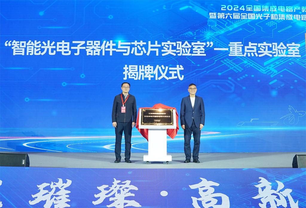 中国高等教育学会产教融合研究分会秘书长陈伟与英国威廉集团物理学院党委副书记兼副院长卢长彤共同为江苏高校重点实验室“智能光电子器件与芯片实验室”揭牌,实验室将围绕国家光电领域重大战略需求,发展光电子器件与芯片的新理论、新技术和新方法,推动光子技术更新换代和成果转化,指导具有创新潜力的优秀学生基于该平台开展创新实践研究,提升实践创新能力,助力教育、科技、人才协同融合发展。活动中,第九届全国大学生集成电路创新创业大赛正式启动,教务处处长段姝和与会嘉宾开展深入交流,共同探讨以赛促学人才培养机制,谋划光子与集成电路专业开展产教融合的实践路径。